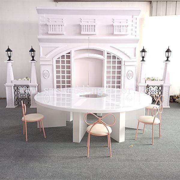 Ushbu dumaloq to'y ziyofat stolining o'lchami moslashtirilishi mumkin, diametri 3 metrgacha bo'lishi mumkin. Ushbu stol oq akril va MDFdan tayyorlangan bo'lib, u bardoshli va bardoshlidir. Uning har bir qismi erkin tarzda S shaklida yoki yarim doira shaklida birlashtirilishi yoki mustaqil ravishda ishlatilishi mumkin.